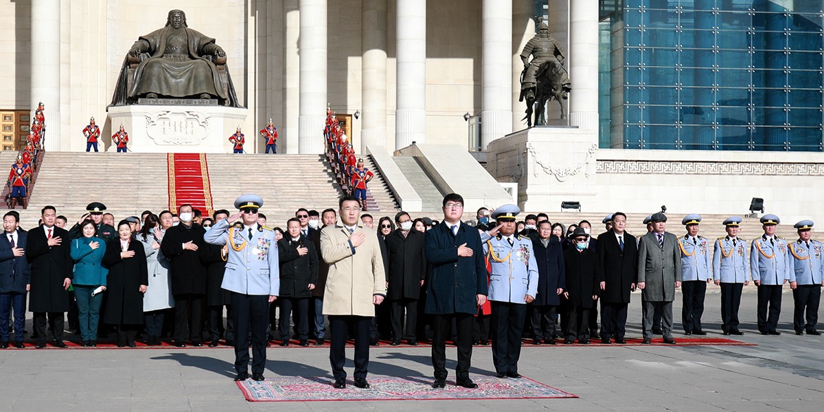 Төрийн болон Нийслэлийн далбааг мандуулах ёслолын ажиллагаанд Төрийн хүндэт харуул, Зэвсэгт хүчний үлгэр жишээ үлээвэр найрал хөгжим, найрал дуучид бүрэн бүрэлдэхүүнээрээ оролцов.