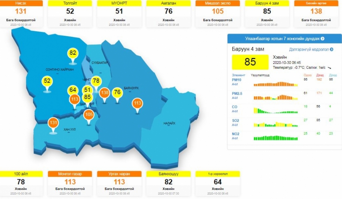 Нийслэлийн агаарын чанарыг 12 цэгээс мэдээлэл авч түгээдэг. Тэгвэл өнөөдрийн 06:00-07:00 цагийн байдлаар Улаанбаатар хотын таван байршилд агаар бага бохирдолтой байна.
