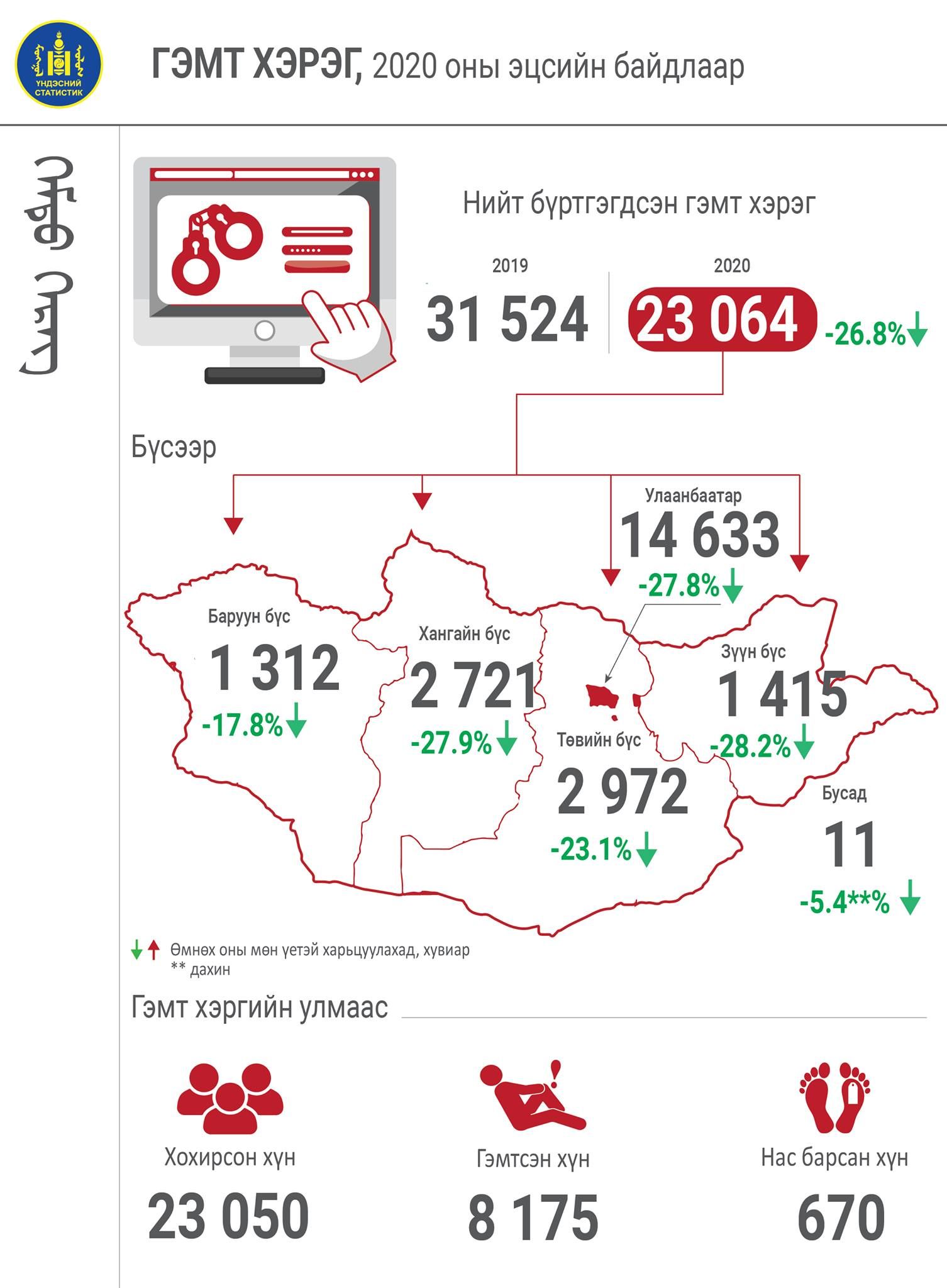 Өнгөрсөн онд 23.1 мянган гэмт хэрэг бүртгэгджээ. Энэ нь 2019 оноос 8,460-аар буюу 26.8 хувиар буурсан үзүүлэлт гэж Үндэсний статистикийн хорооноос мэдээллээ.
