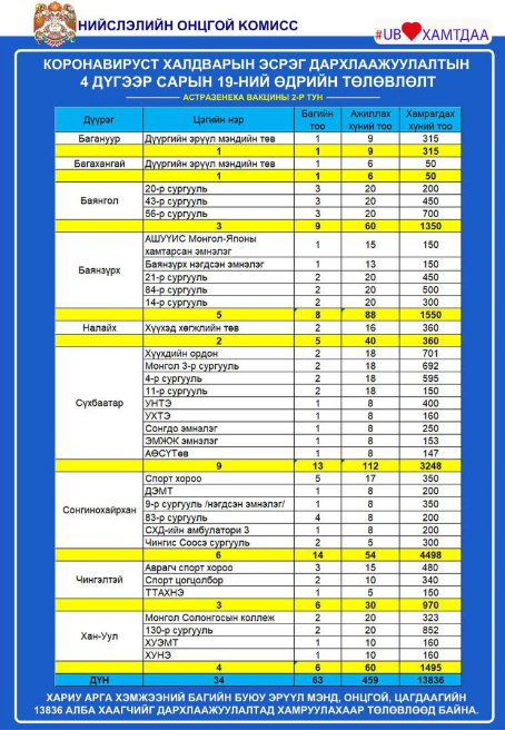 Иймд дараах 34 цэгт хариу арга хэмжээний багт ажиллаж буй 13836 хүнийг дархлаажуулалтын хоёр дахь тунд хамруулахаар төлөвлөжээ.