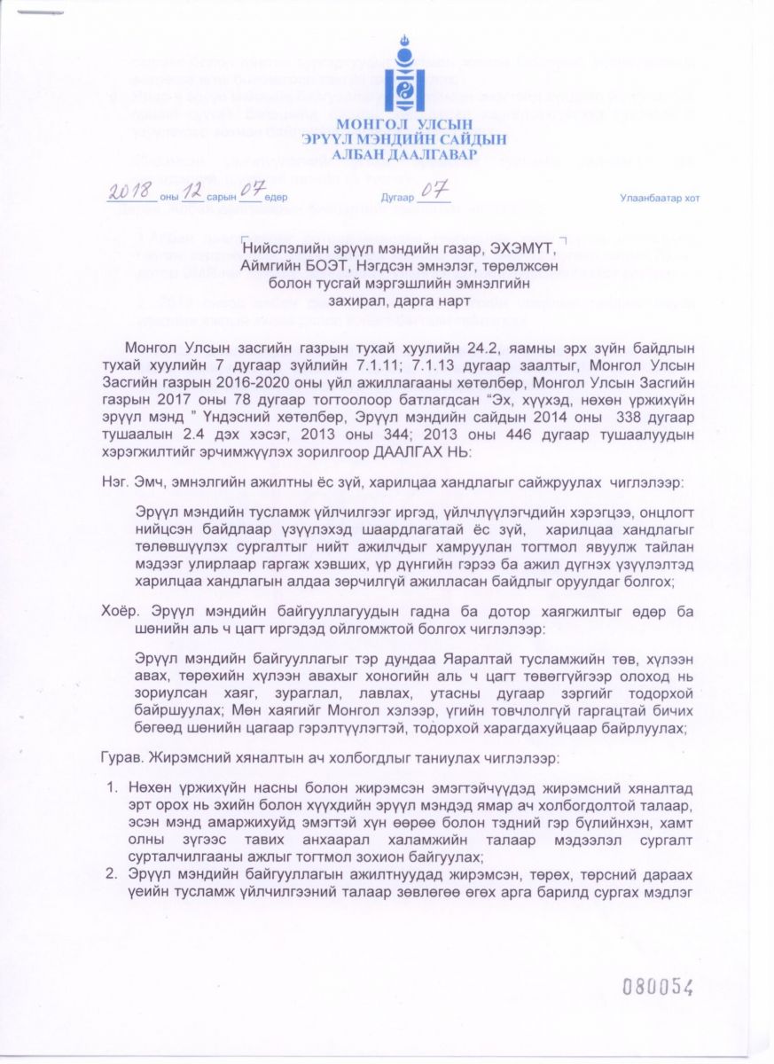 ЭХЭМҮТ-ийн гадаа эх төрсөн болон эмнэлгийн ажилтнуудын харилцаа хандлагатай холбооотой албан даалгаврыг Эрүүл мэндийн сайд Д.Сарангэрэл өчигдөр гаргалаа.