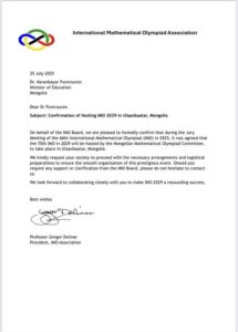 Боловсролын яамны сайд П.Наранбаяр: Олон улсын математикийн олимпиадыг 2029 онд Монгол Улсад зохион байгуулах боллоо. Олон жилийн хүчин чармайлт, сүүлийн жилүүдийн олимпиадад оролцсон Монголын багийн амжилт энэхүү үр дүнд хүргэв. Монголын Математикийн олимпиадын хорооны хамт олонд талархал илэрхийлье!