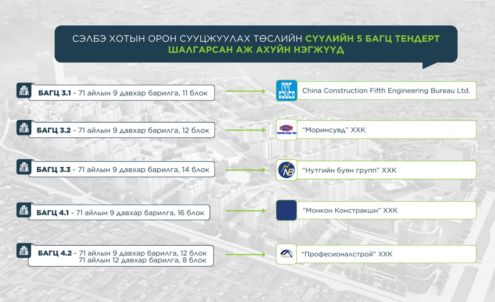 • Багц 3.1 буюу Сэлбэ дэд төвийн 71 айлын есөн давхар бүхий 11 блок орон сууцны иж бүрэн цогцолбор хорооллын тендерт “China Construction Fifth Engineering Bureau” компани,
