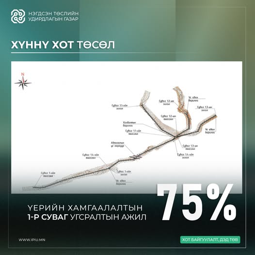Суваг-1.4. 1745м, газар хайрган хөрс зөөвөрлөн байгалийн гуу жалга дүүргэж булалт нягтруулга хийсэн. Шүд цутгах ажил 98% гүйцэтгэлтэй, сувгийн төмөр бетон хавтан угсрах, элсэн дэвгэр, нягтруулгын ажил, бетон хавтан хоорондын чигжээс бетон гагнаасын ажлууд хийгдэж байна.