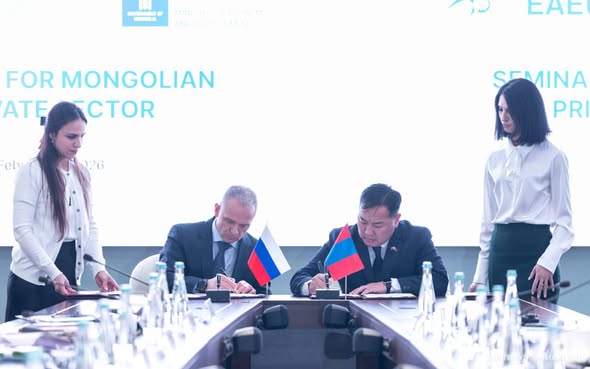 Тэрбээр өчигдөр (2026.02.09) Евразийн эдийн засгийн холбооноос Монголын аж ахуйн нэгжүүд, бизнес эрхлэгчдэд зориулан зохион байгуулсан Худалдааны түр хэлэлцээрийн талаарх бизнес хэлэлцүүлгийг нээж, үг хэллээ.