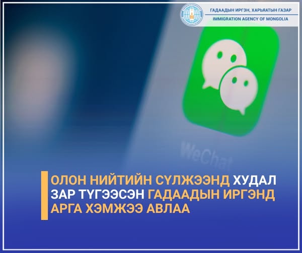 Тодруулбал, WeChat сүлжээнд байршуулсан “Монгол Улсын виз, оршин суух зөвшөөрөл гаргуулж өгнө, мөн албадан гаргах арга хэмжээнээс чөлөөлүүлнэ” гэх агуулгатай зарын дагуу хяналт шалгалт явуулахад БНХАУ-ын нэр бүхий иргэн нь олон нийтэд худал мэдээлэл түгээж, хууль бус үйл ажиллагаа явуулсан нь тогтоогдсон. Иймд тухайн гадаадын иргэнийг “Тусгай тэмдэглэл”-д бүртгэж, цаашид Монгол Улсын виз, оршин суух зөвшөөрөл олгохгүй байхаар шийдвэрлэв.